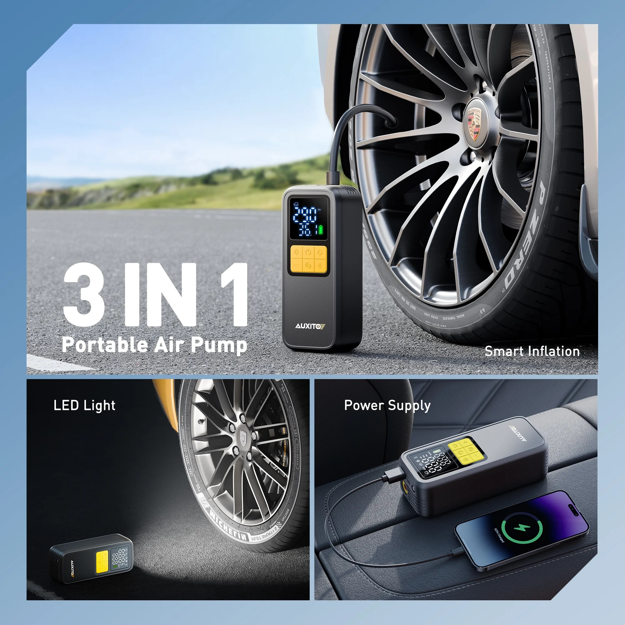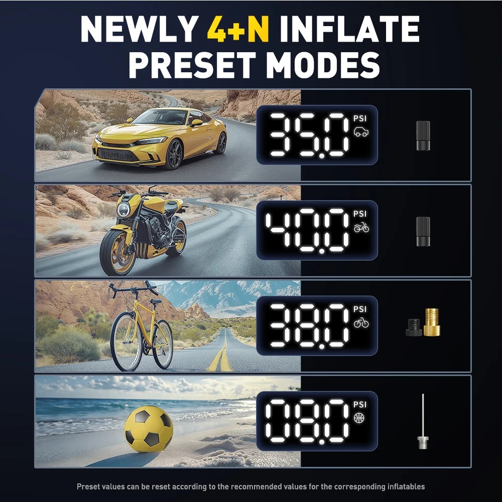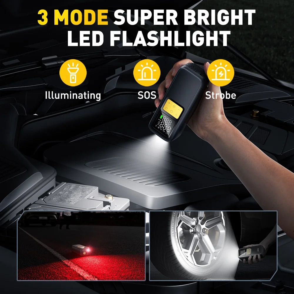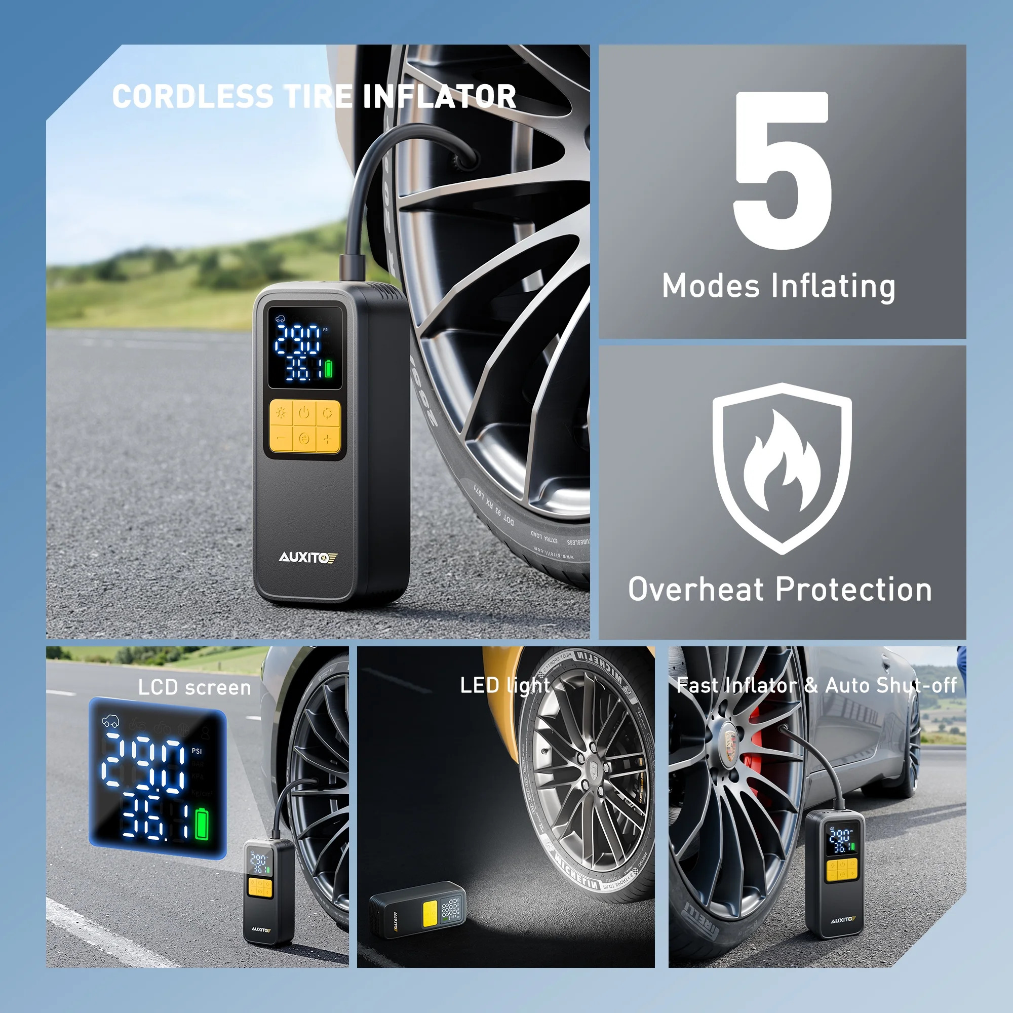 - 1 MIN Fast Inflation: AUXITO car air pump equipped with upgraded air cylinder and powerful motor which can produce 36L/min airflow, pump up a standard car tire from 0psi to 36psi within 5 minutes, less than 1 minute to add 7psi (29-36), saving you valuable time when you’re on the go, no more waiting around at gas stations.