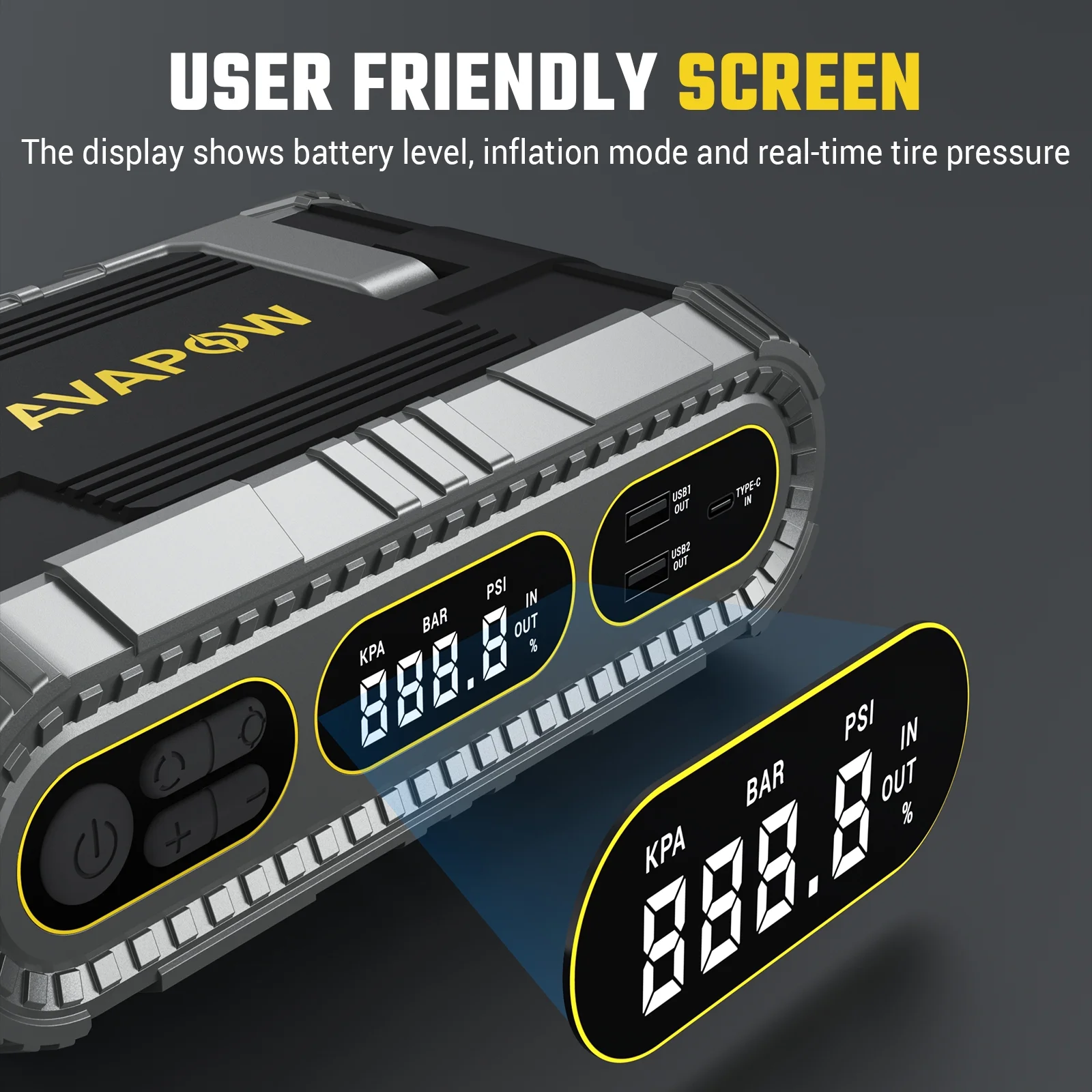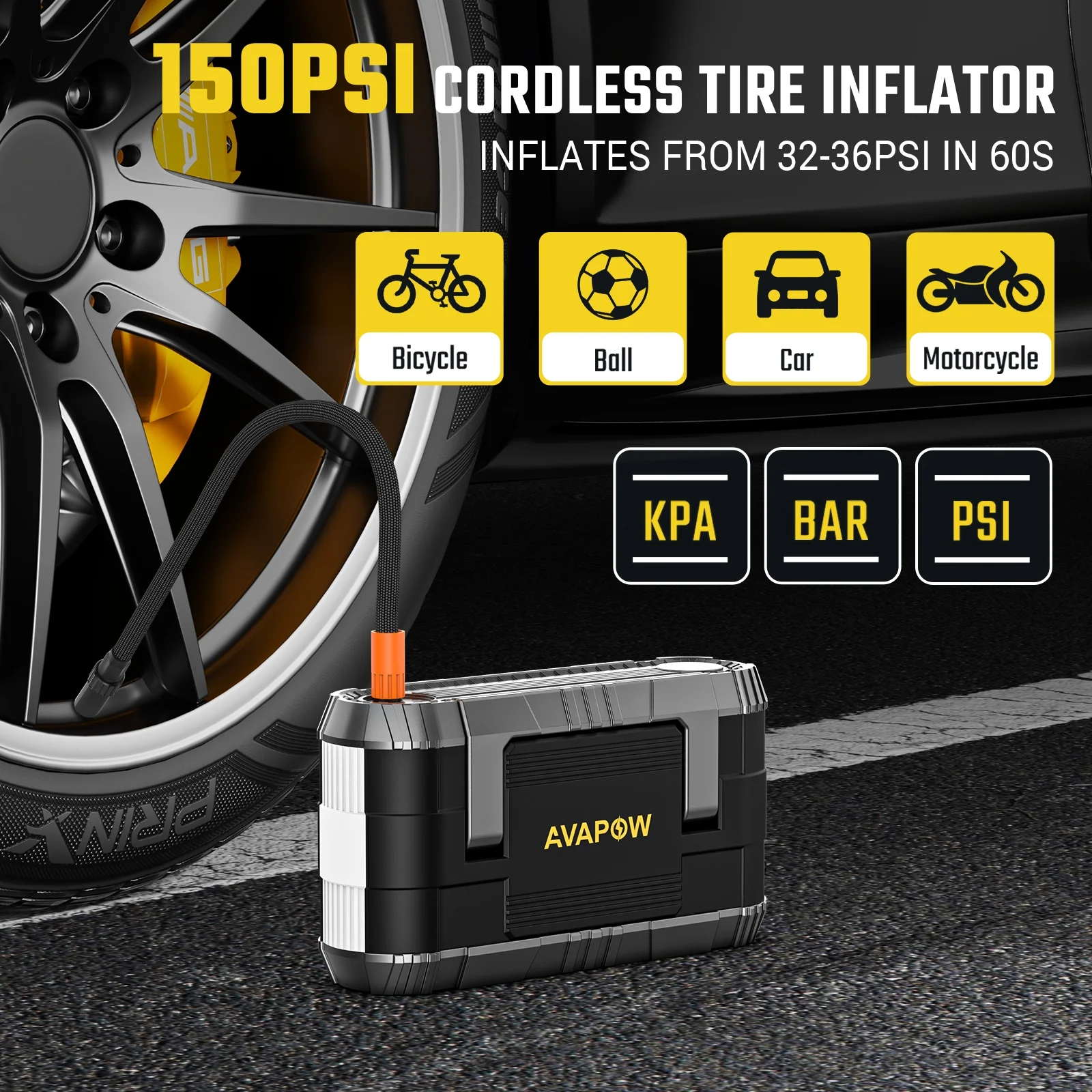 - Digital Display & Safety: Cordless inflator with an LED digital gauge showing battery level, inflation mode, and real-time tire pressure, with automatic shut-off at preset values and 3 optional units (PSI, BAR, KPA).