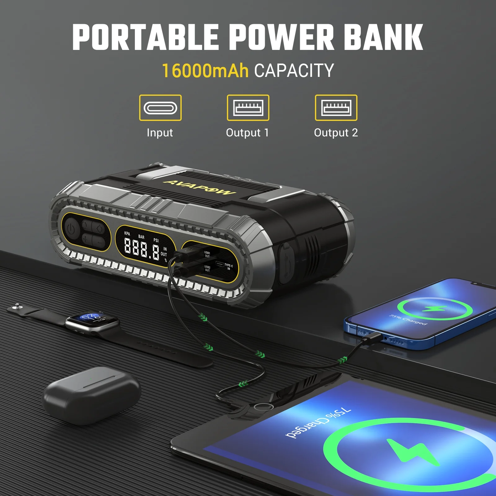 - Integrated Air Compressor: Built-in 150PSI air compressor with an extension hose and 4 inflation needles, suitable for car tires, bikes, air beds, and balls, inflating car tires from 0 to 36 psi in 5 minutes.