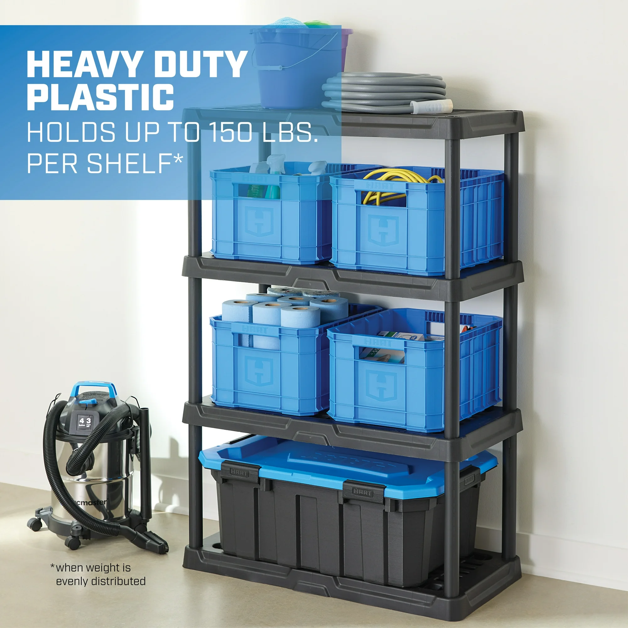 150 lbs. per shelf (68 kilos), evenly distributed